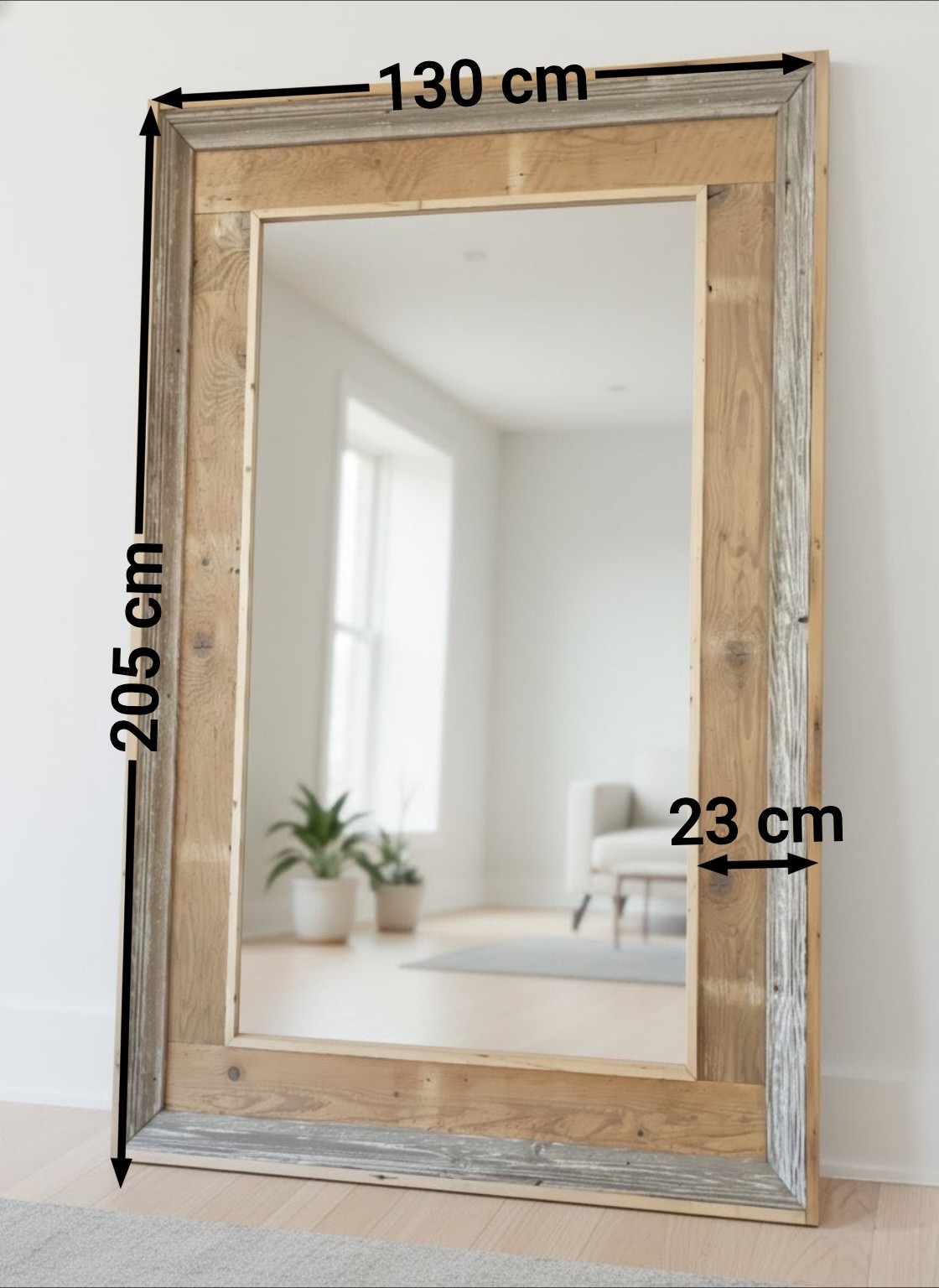 Impactante espejo de diseño sustentable fabricado íntegramente en Pino Oregón reciclado. Con un marco extra ancho de 23 cm, esta pieza de gran porte es ideal para ser el centro de atención en livings, amplios recibidores o salones comerciales.