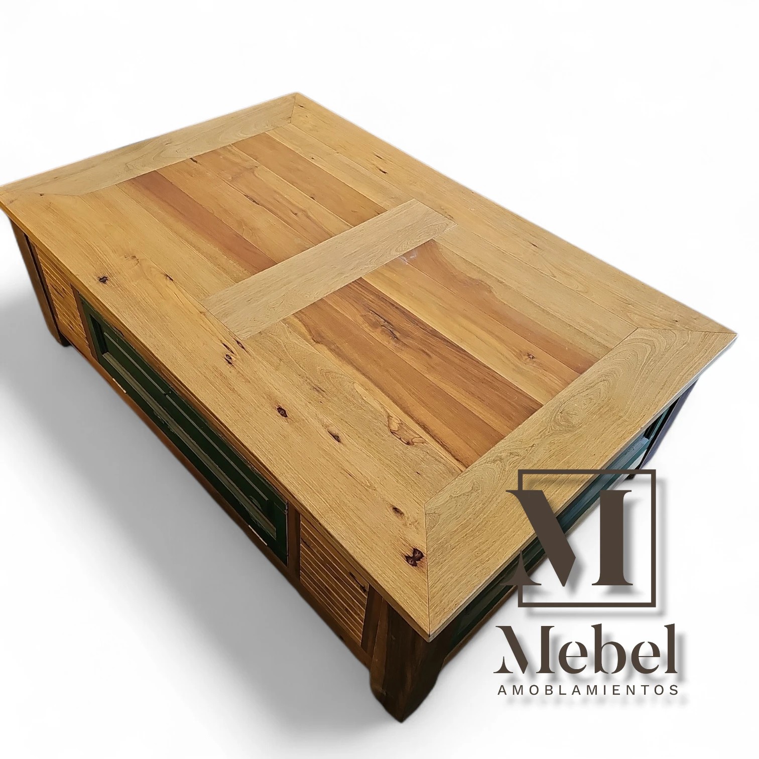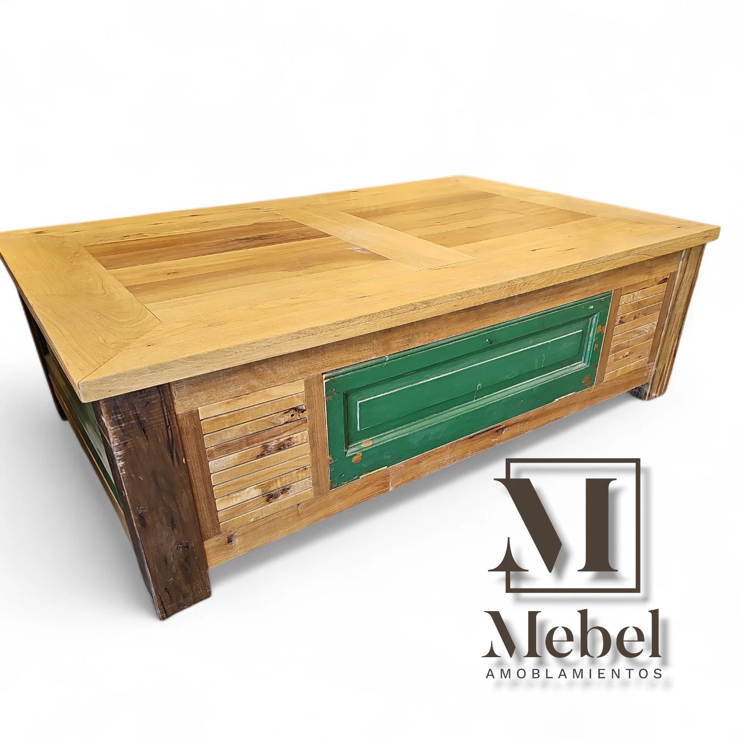 Diseño Único: Laterales construidos con tableros que emulan puertas antiguas, incluyendo un frente destacado en verde desgastado que aporta color y carácter.