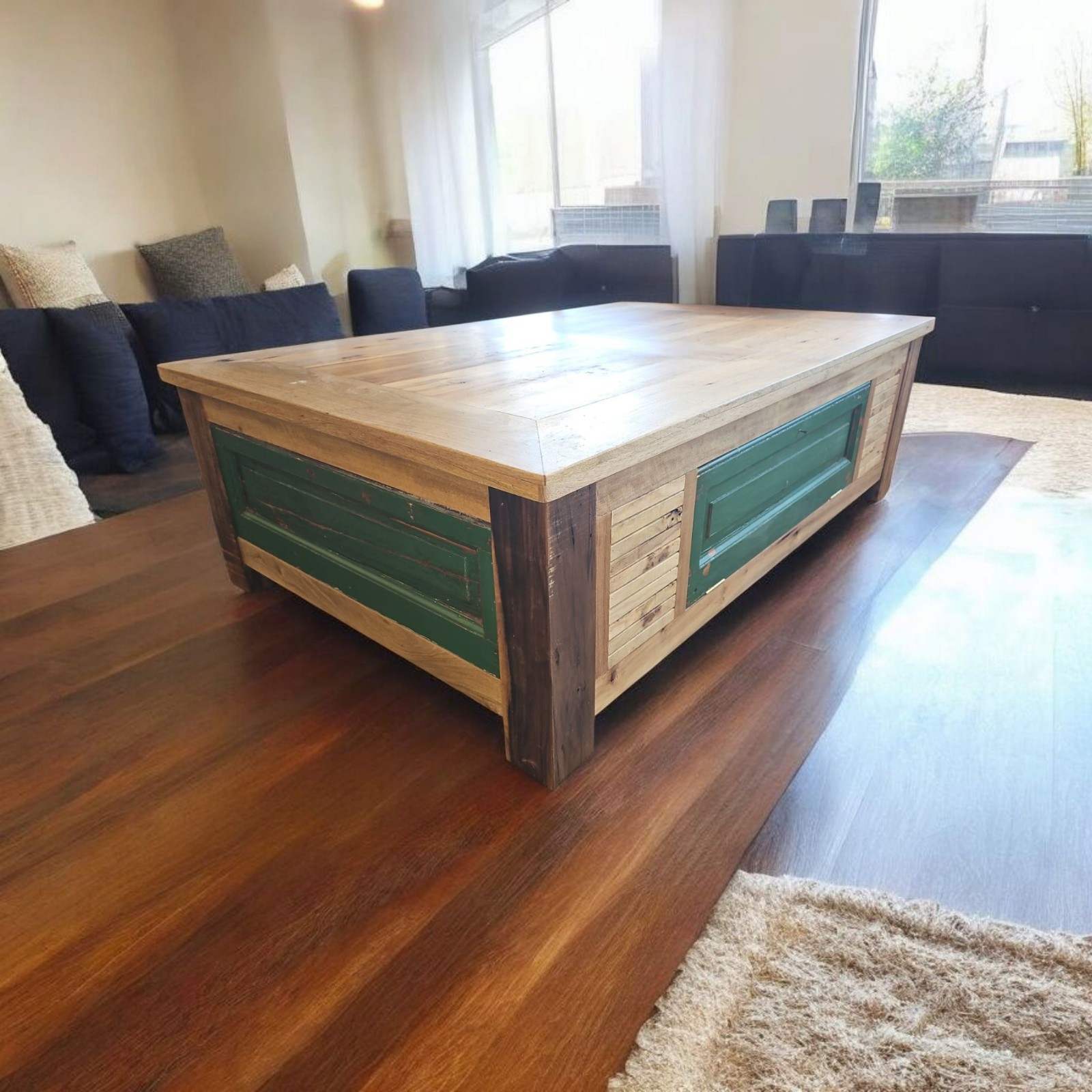 Mesa ratona de estilo rústico industrial con gran capacidad de guardado. Fabricada con maderas recuperadas y paneles laterales tipo puerta. Una pieza robusta, funcional y con un diseño único de 1,50 x 1,00 mts que se convierte en el centro de cualquier living.