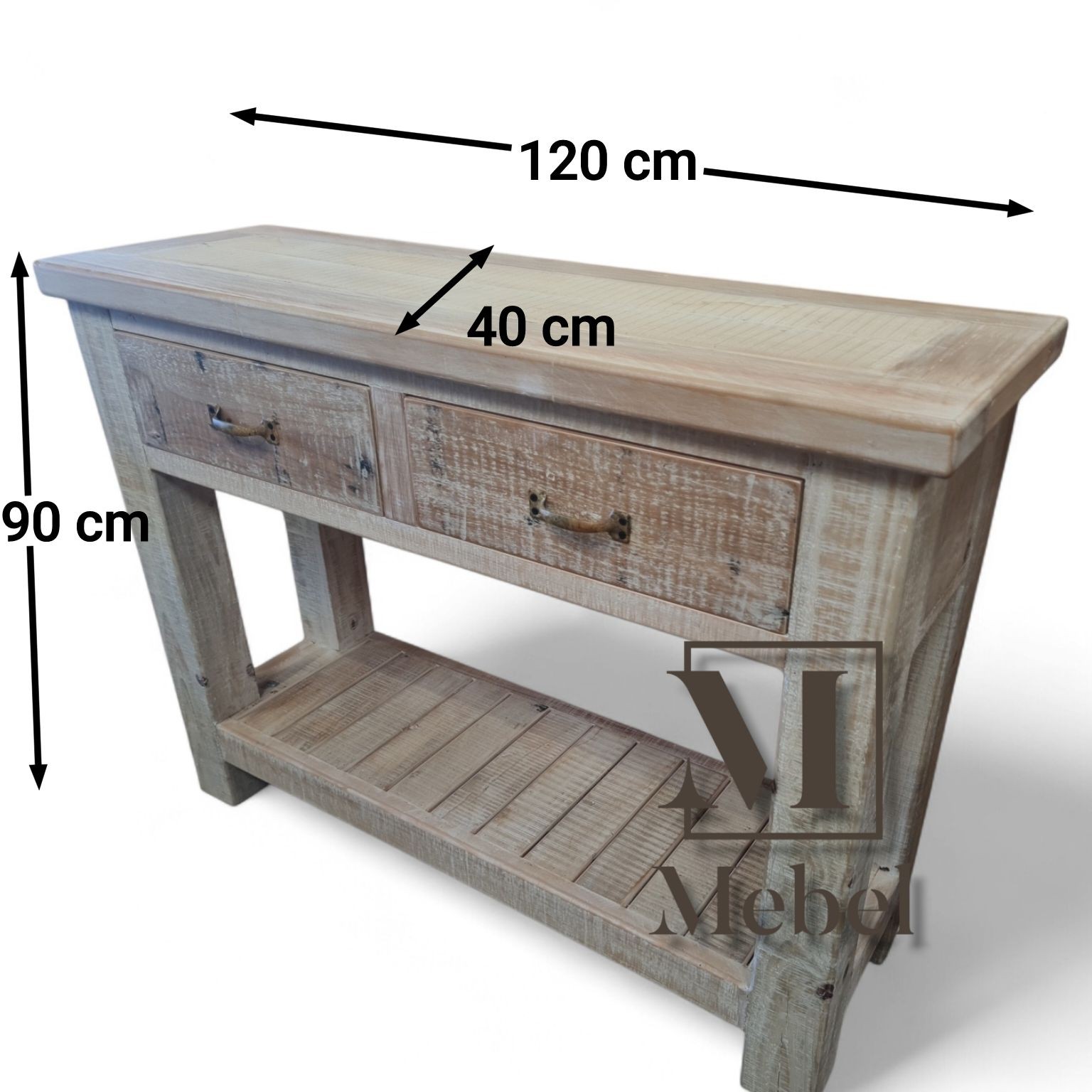 Dale vida a tu entrada con nuestra mesa de arrime en pino brasil rústico. Con 120 cm de ancho, 90 cm de alto y 40 cm de profundidad, es el equilibrio perfecto entre funcionalidad y estilo Shabby Chic. Acabado decapado en blanco con protección de laca poliuretánica.