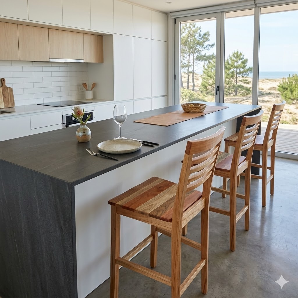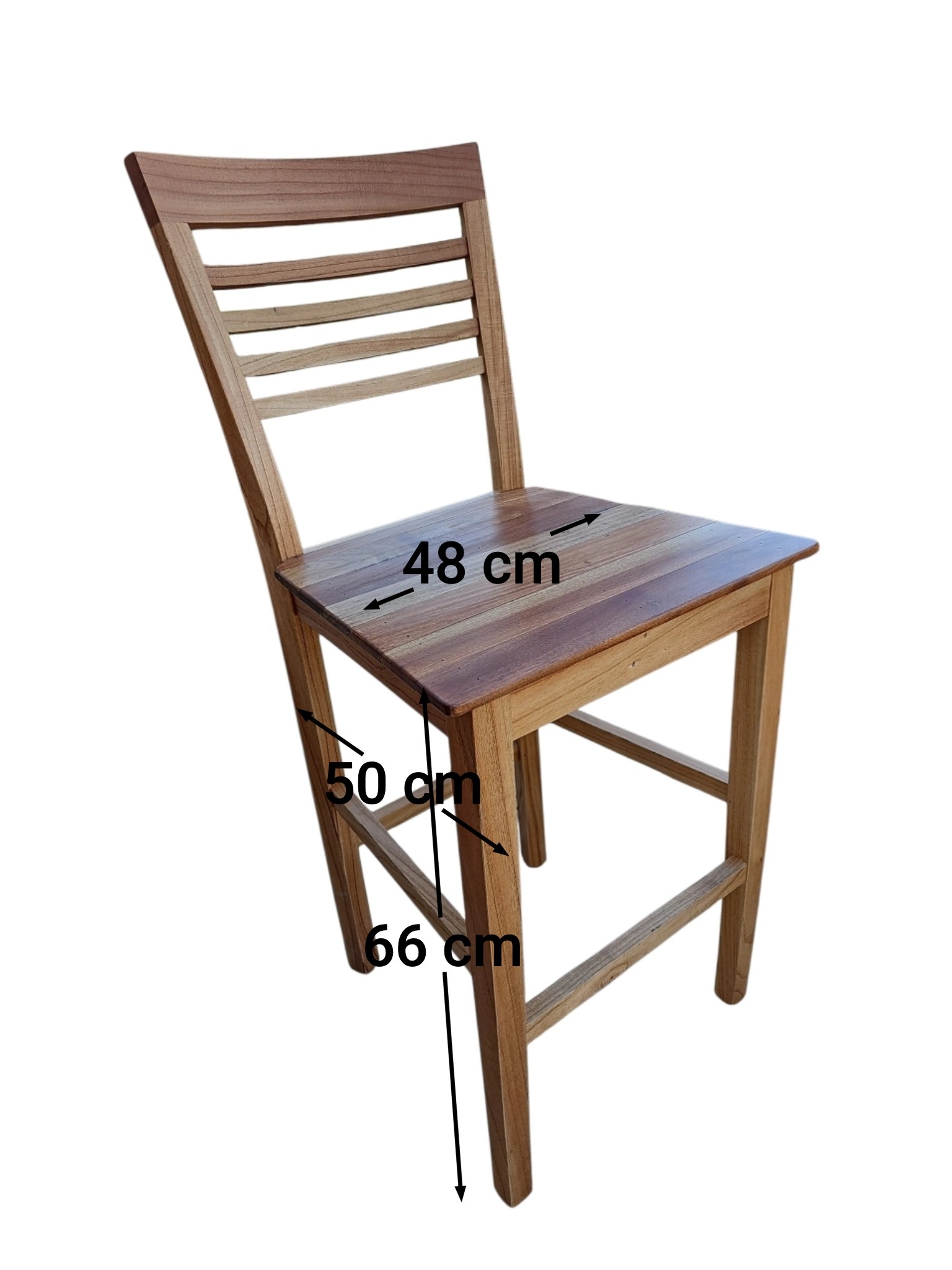 Esta Banqueta Modelo Elisa es una pieza de diseño superior. La combinación de maderas es su punto más fuerte: el Paraíso para la estructura (claro y moderno) y el Vira-ró para el asiento (madera noble, rojiza y extremadamente resistente). Al ser una banqueta de 50 cm de altura, es ideal para mesas de altura estándar o barras bajas, lo cual es un dato clave para que el chatbot asesore bien.