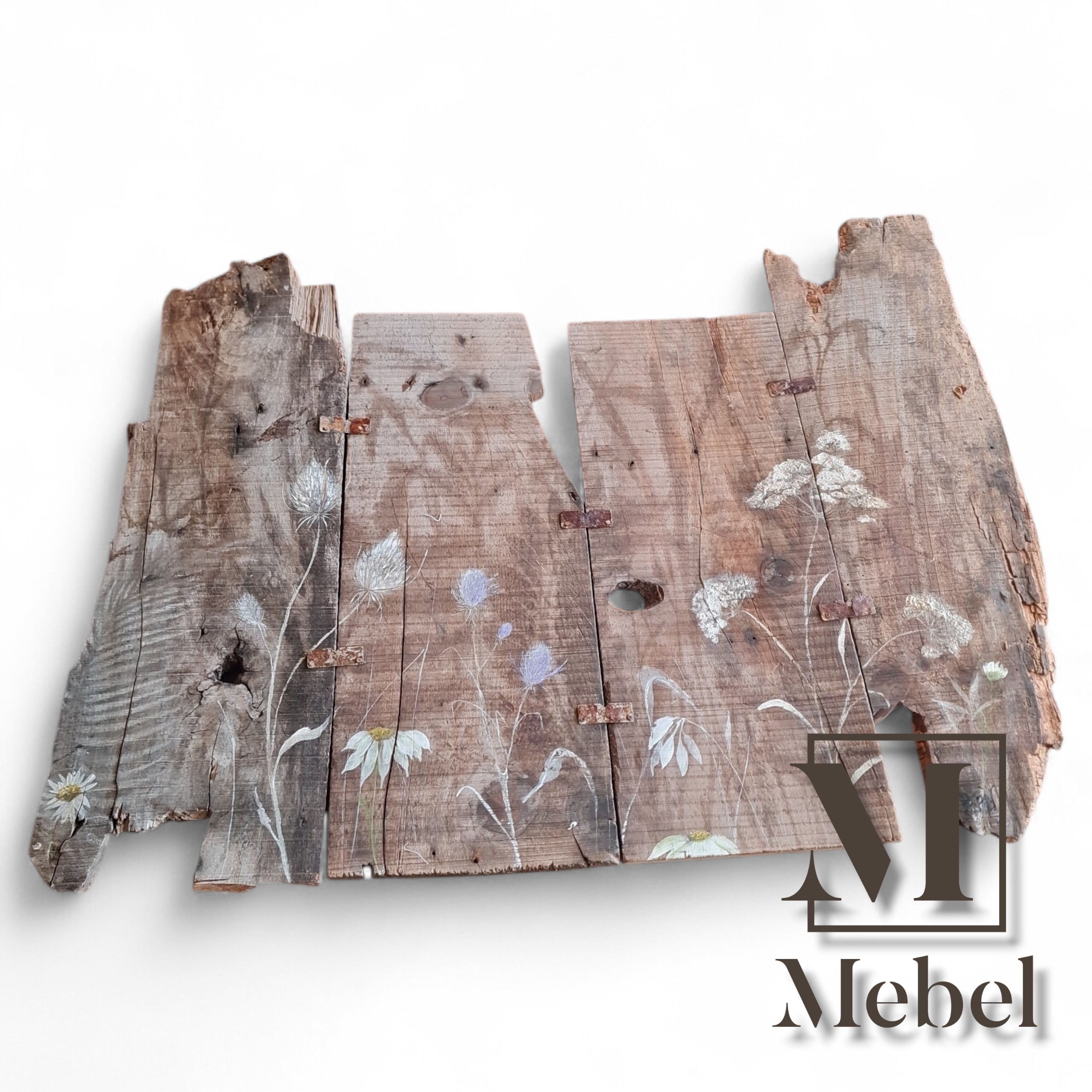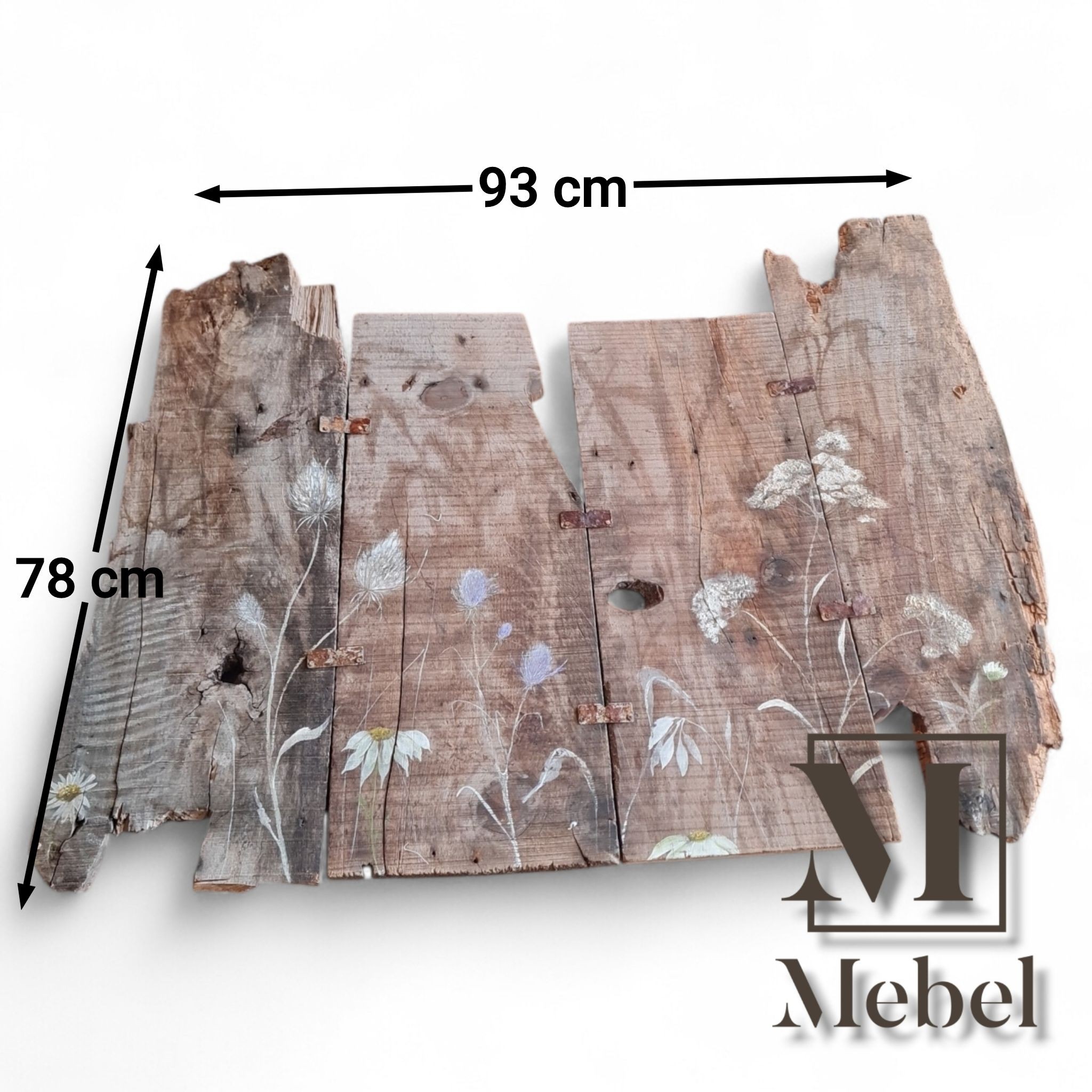Transformá cualquier pared con este imponente cuadro mural de 93x78 cm. Creado con tablones de madera rústica unidos por bisagras de hierro, y pintado a mano con delicadas flores silvestres. Aporta una textura única y un encanto campestre inigualable a tu decoración.