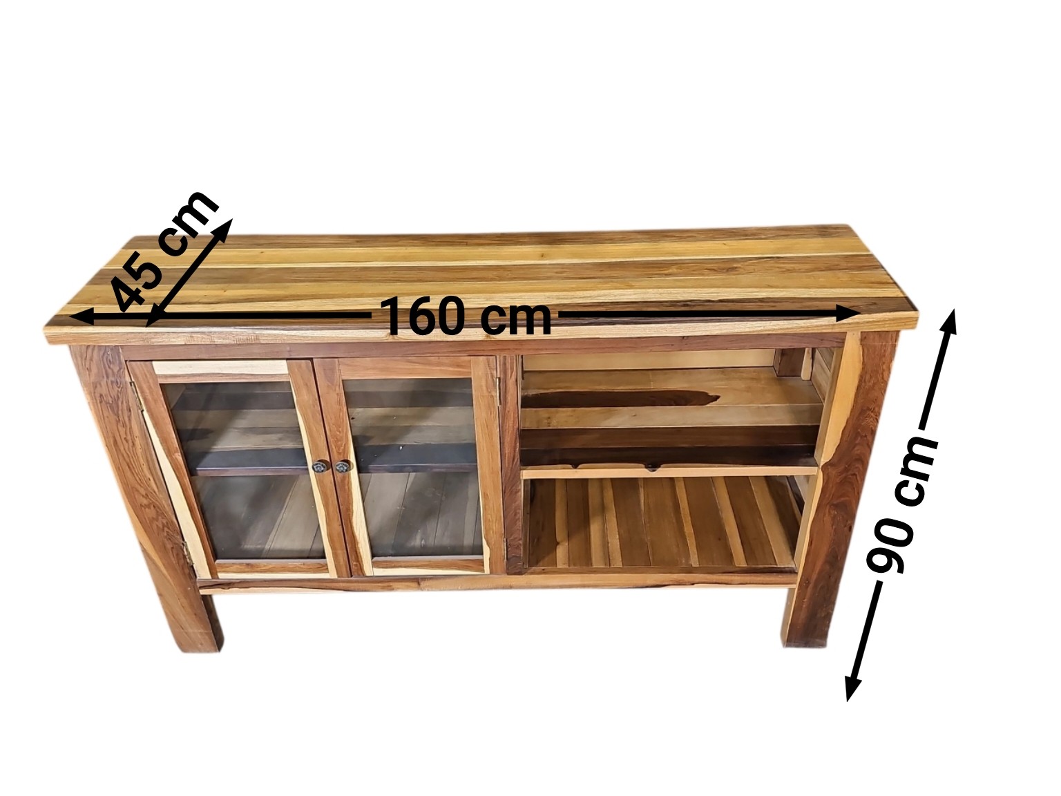 Realizado artesanalmente con la técnica de entablonado en madera maciza de Guayubira, cada mueble exhibe un mosaico único de vetas y tonalidades que lo convierte en una pieza irrepetible. Su diseño inteligente ofrece una solución de almacenamiento mixta, pensada para las necesidades actuales.