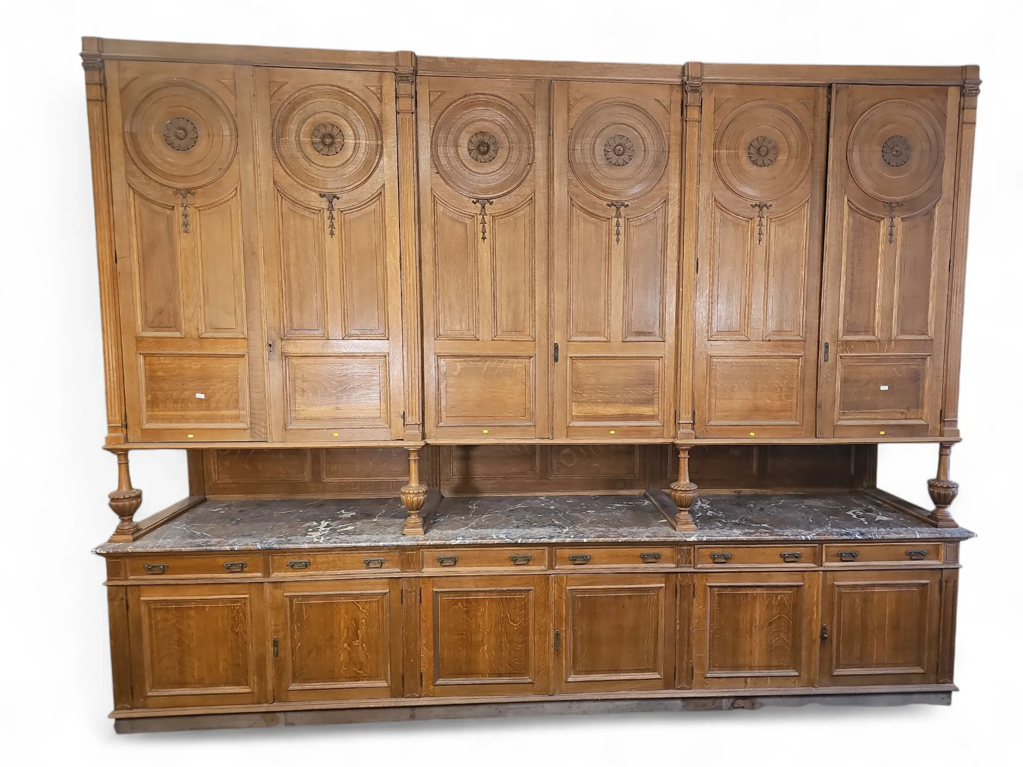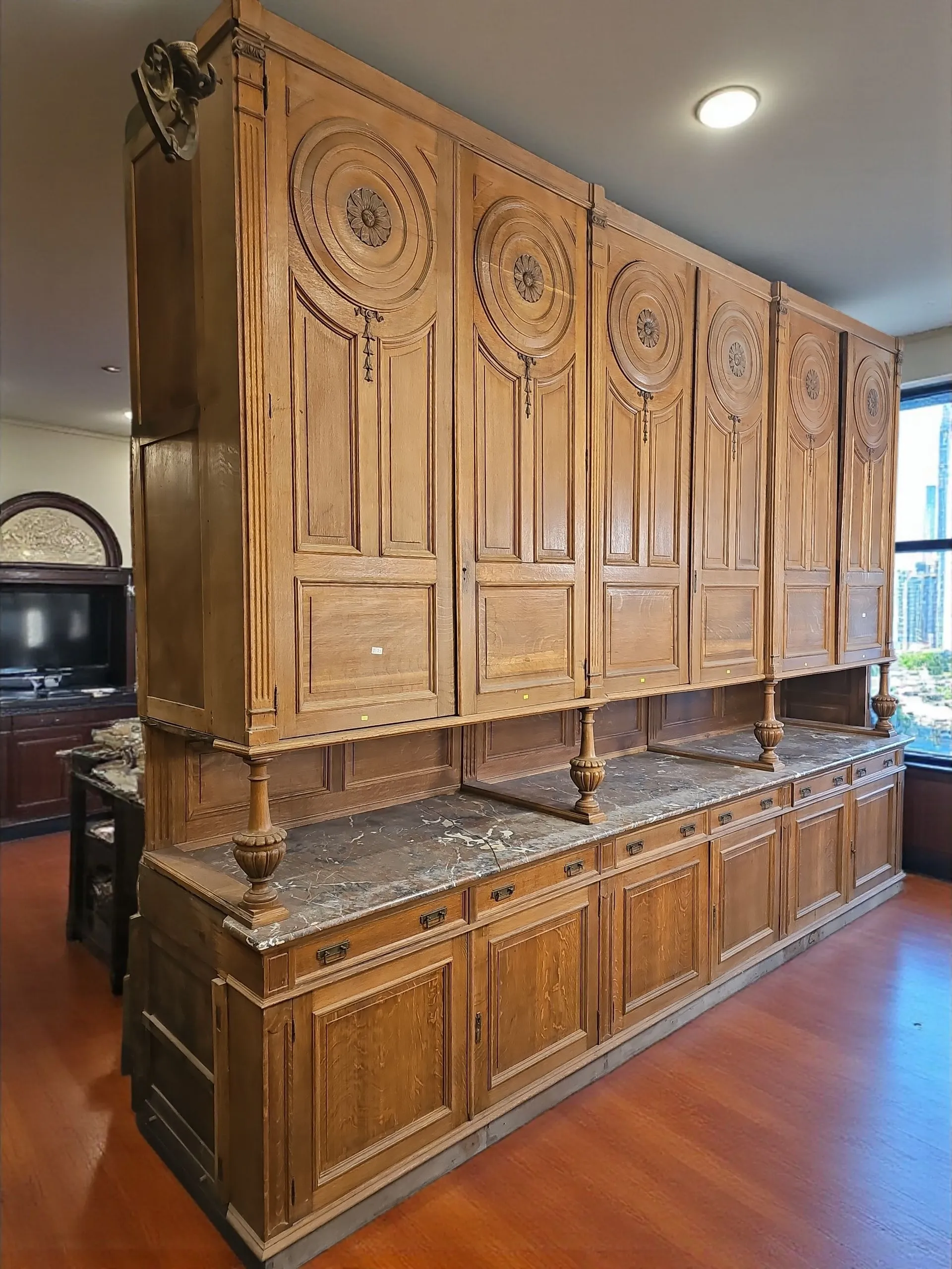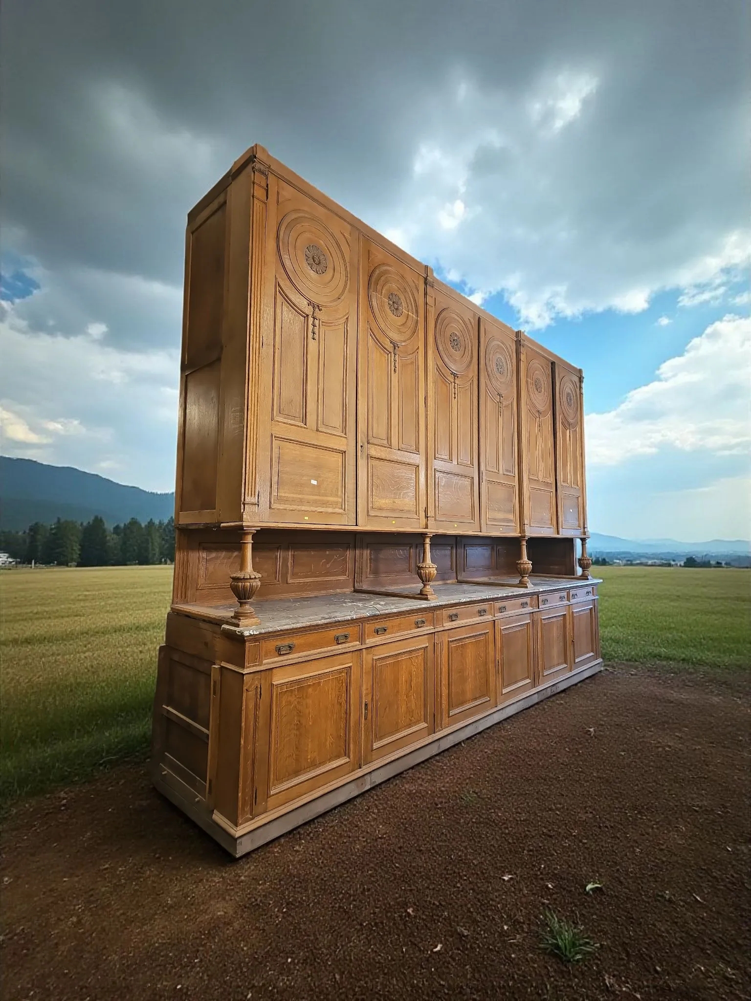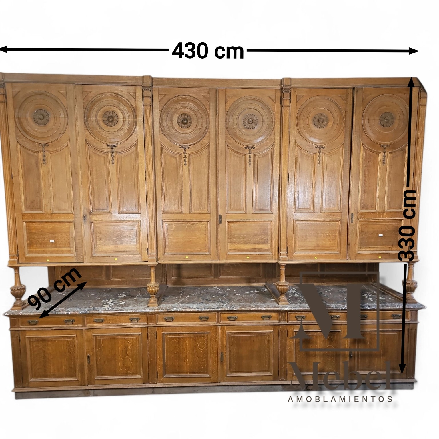 Imponente aparador europeo de 1860, confeccionado íntegramente en roble macizo de primera calidad, con tapa de mármol dividida en tres piezas que aporta solidez y elegancia.