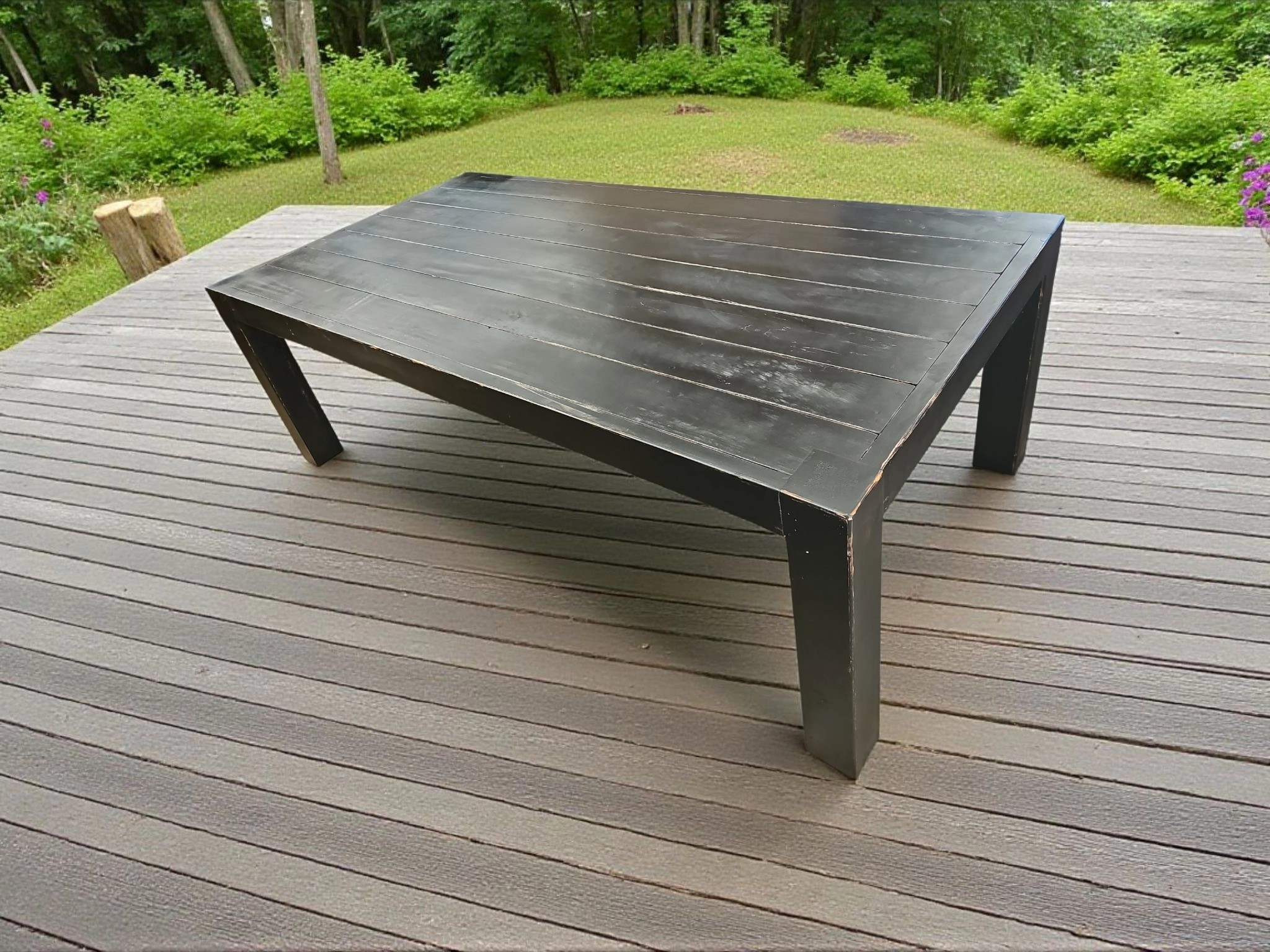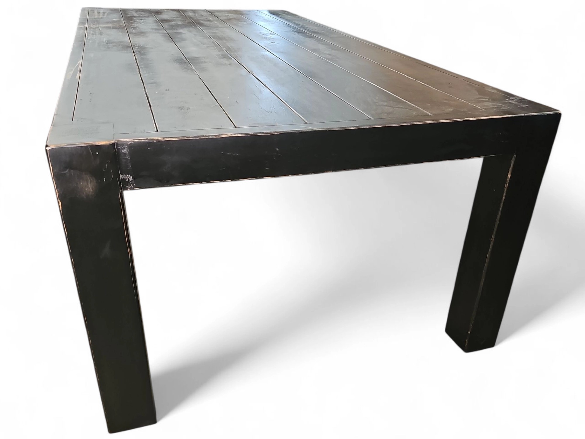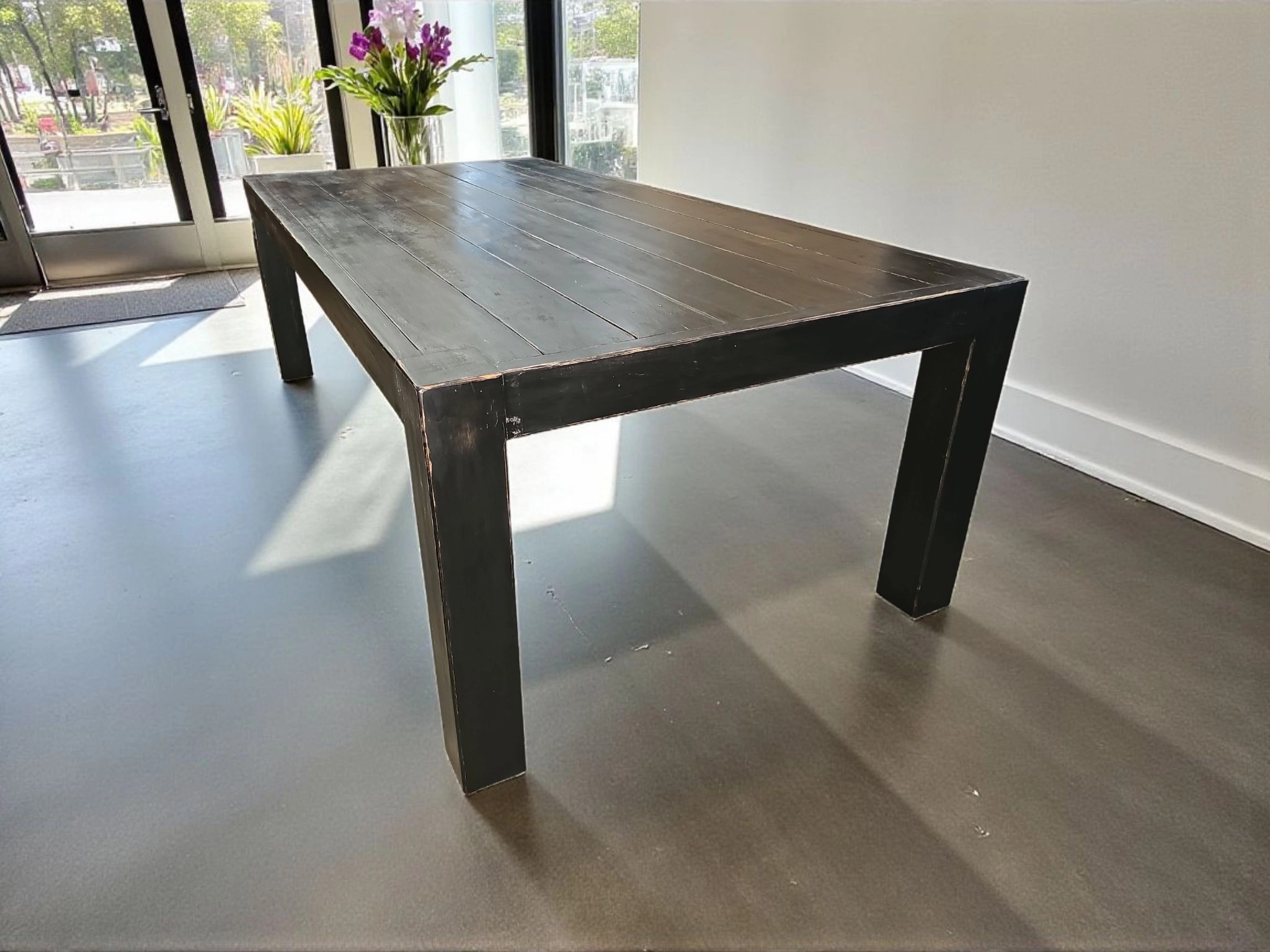 Mesa robusta y elegante fabricada en madera maciza, pintada en color negro con detalles levemente desgastados que realzan su estilo rústico-moderno. Su acabado en poliuretano brinda mayor resistencia, protección y durabilidad, ideal tanto para uso diario como para espacios de diseño.